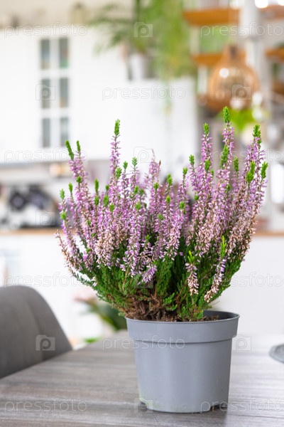 Цветущий вереск в горшке на столе в интерьере дома. Весеннее время, подготовка к посадке в открытом грунте, саженец для клумбы, цветочное хобби, комнатное растение