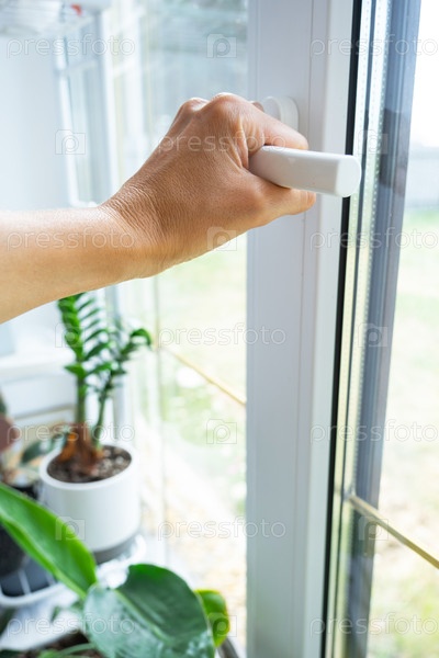Рука держит рукоятку пластикового стеклопакета, закрывая и открывая окно поворотным механизмом, положение рукоятки для вентиляции, микровентиляции