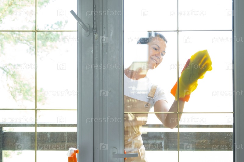Женщина в резиновых перчатках и фартуке вручную моет оконный балкон дома тряпкой и шваброй снаружи за стеклом. Восстановление порядка и чистоты весной, уборка сервиза