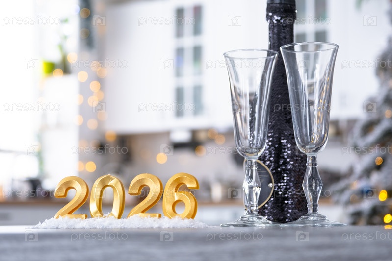 Золотые фигуры насчитывают Новый год на фоне крошечного дома с теплым светом и гирляндами. Приветственная открытка, С Новым годом, уютный дом