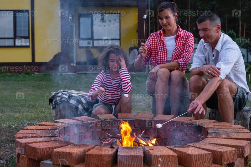 Семья мама, папа, дочь жарят зефир на шашлыках на костре в очаге во дворе дома у пожарной ямы уютным летним вечером