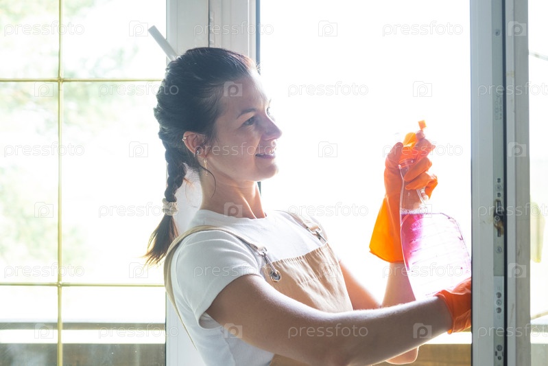 Женщина Портрет в резиновых перчатках и фартук вручную моет оконный балкон дома тряпкой и шваброй внутри интерьера. Восстановление порядка и чистоты весной, уборка сервиза