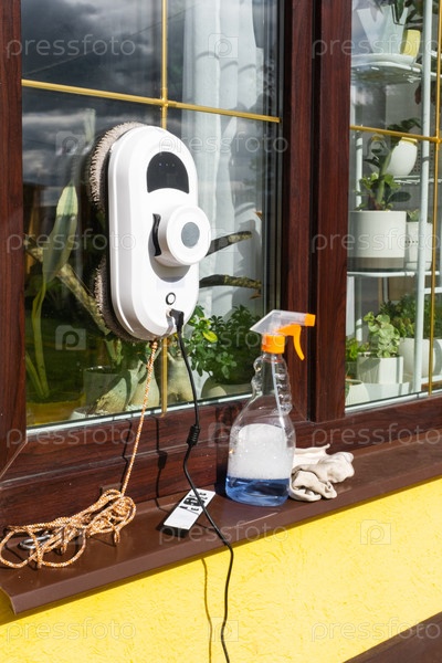 Робот-очиститель окон очищает окна в доме снаружи. Помощник по уборке, безопасная уборка окон, пульт дистанционного управления