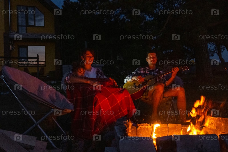 Семья сидит у костра, мужчина играет на гитаре, женщина слушает и поет, дочь завернулась в одеяло. Семейный летний вечер во дворе дома