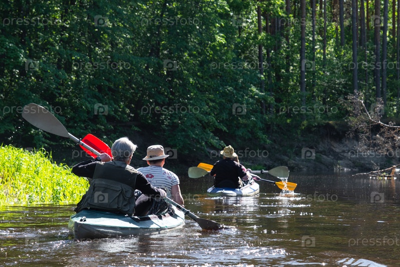 Групповая поездка на байдарках для сеньора и сеньоры. Пожилая пара и взрослая гребная лодка на реке, поход по воде, летнее приключение. Возрастные виды спорта, умственная молодость и здоровье, туризм, активная старость