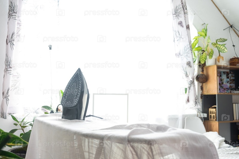 Железо находится на гладильной доске с простой тканью в комнате крупным планом