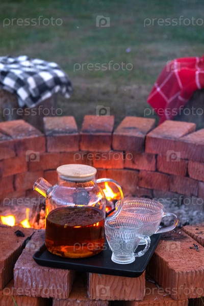 Прозрачный чайник с чаем, чашки на подносе на кирпичной огненной яме во дворе дома в уютный летний вечер