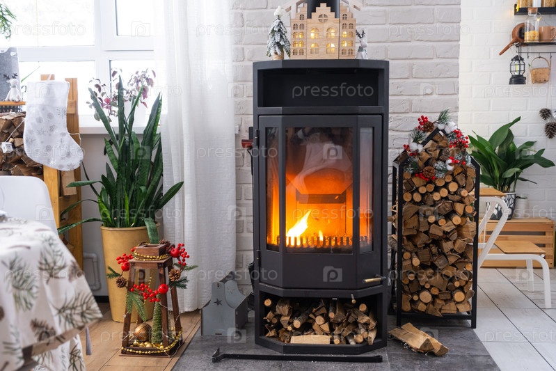 Металлическая черная печь, горящий очаг камина в белом праздничном интерьере дома украшают на Рождество и Новый год, елку. дрова в древесине, уют и отопление дома