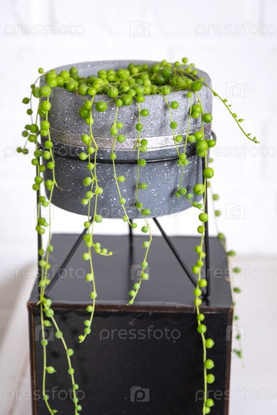 Длинные ресницы суккулента Senecio rowleyanus в бетонном горшке висят с круглыми черепаховыми листьями. Senecio rowley крупный план в интерьере на белом фоне, декоративное растение