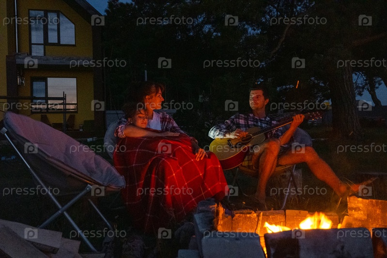 Семья сидит у костра, мужчина играет на гитаре, женщина слушает и поет, дочь завернулась в одеяло. Семейный летний вечер во дворе дома