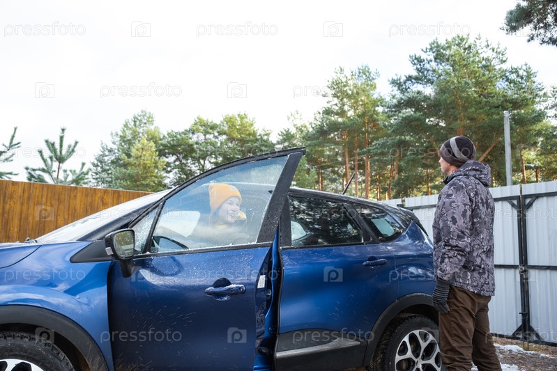 Женщина садится за руль, муж и жена садятся в машину возле дома во дворе