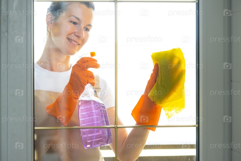 Женщина в резиновых перчатках и фартуке вручную моет оконный балкон дома тряпкой и шваброй снаружи за стеклом. Восстановление порядка и чистоты весной, уборка сервиза