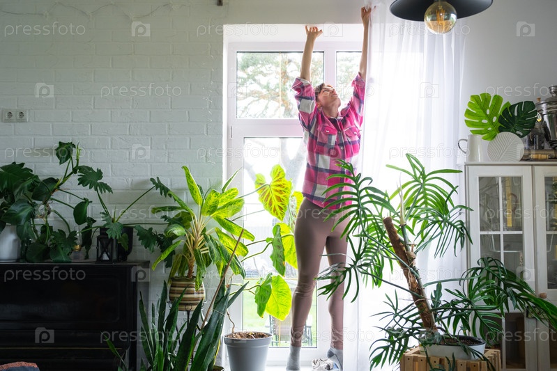 Женщина вешает прозрачные тюльские шторы на большие окна в доме внутри интерьера. Весенняя уборка, уборка