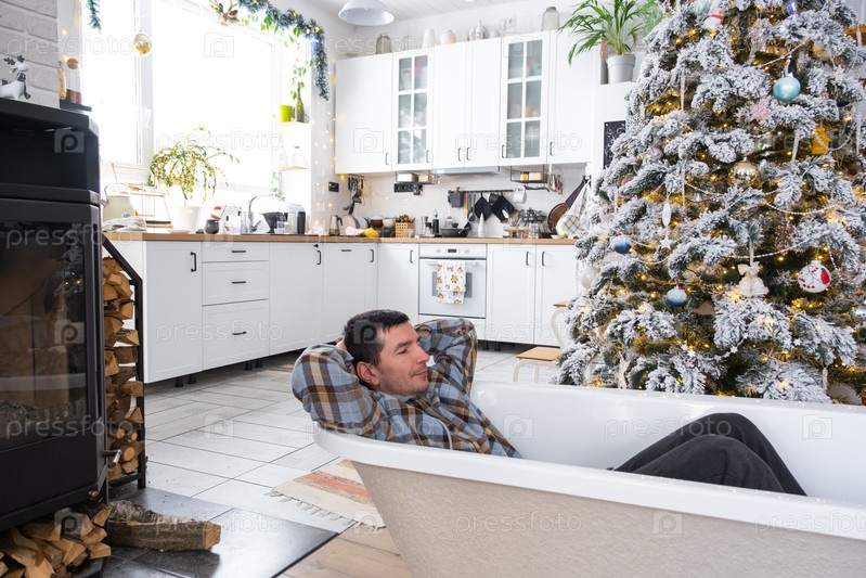 Мужчина лежит отдыхающим в Новой ванне под елкой в качестве новогоднего подарка в интерьере белой декорированной кухни. Реконструкция и дизайн интерьера, строительство и улучшение дома