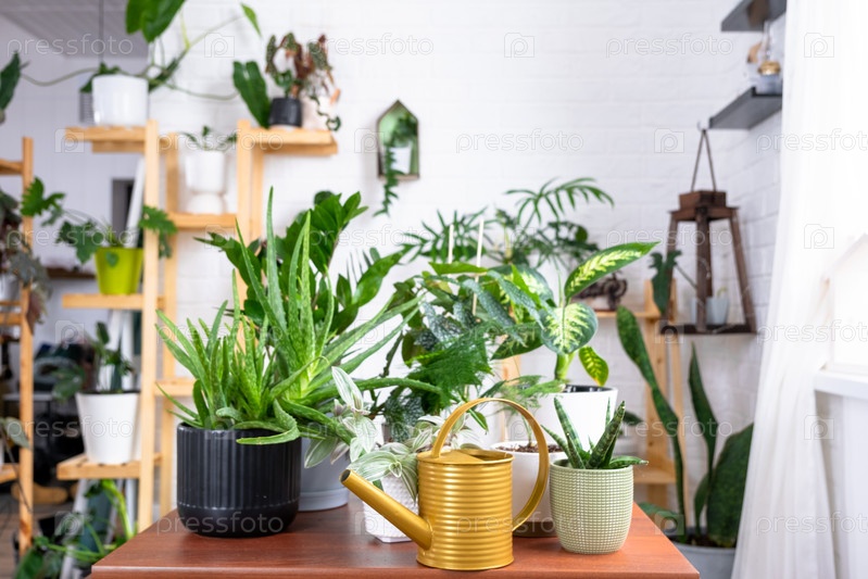 Группа популярных комнатных растений на столе в интерьере: Калатея, алоэ, диффенбахия, сансевьерия, фикус. Выращивание и уход за комнатным растением, зеленым домом, ирригация, удобрения