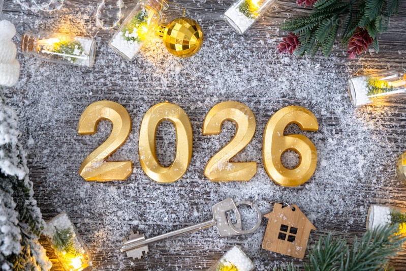 Золотые фигуры насчитывают Новый год на фоне крошечного дома с теплым светом и гирляндами. Приветственная открытка, С Новым годом, уютный дом