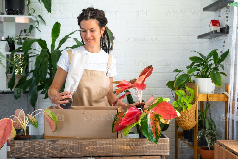 Женщина распаковывает коробку с посылкой горшечных цветов красного аглаонема - заказ завернутых тропических растений, доставка. Продажа, безопасная отправка растений из магазина, упаковка. Цветочный магазин, домашний бизнес