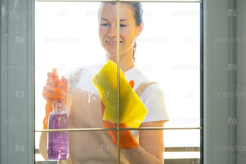 Женщина в резиновых перчатках и фартуке вручную моет оконный балкон дома тряпкой и шваброй снаружи за стеклом. Восстановление порядка и чистоты весной, уборка сервиза