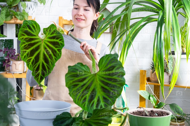Женщина в фартуке держит большой полосатый лист филодендрона и ухаживает за горшечным растением, пересаживая и пересаживая крупное домашнее растение Philodendron verrucosum в новый больший горшок в домашнем интерьере