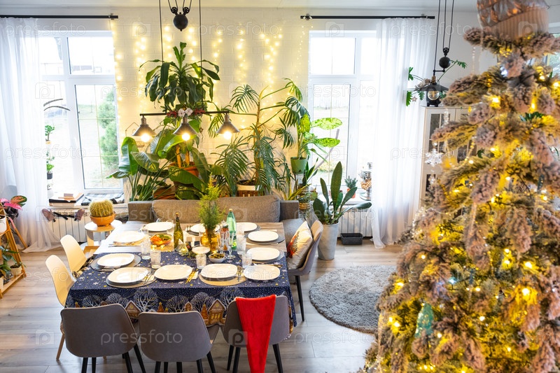 Праздничный стол, установленный для гостей на Рождество и Новый год, рождественская елка в гостиной, тарелки, бутылки, стаканы, горшечные растения, сказочные огни