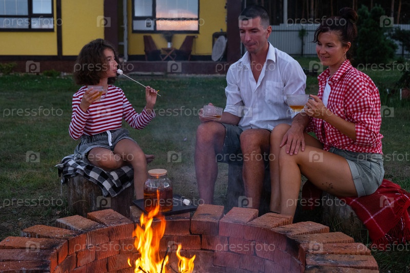 Семья мамы, папы, дочери пьют чай во дворе дома у пожарной ямы уютным летним вечером