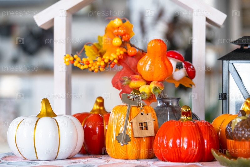 Уютный осенний декор на белой кухне с крошечным домом и ключами, тыквами, осенними листьями, осенним настроением, Хэллоуином, Праздником урожая, жильем, переселением, ипотекой, страховкой