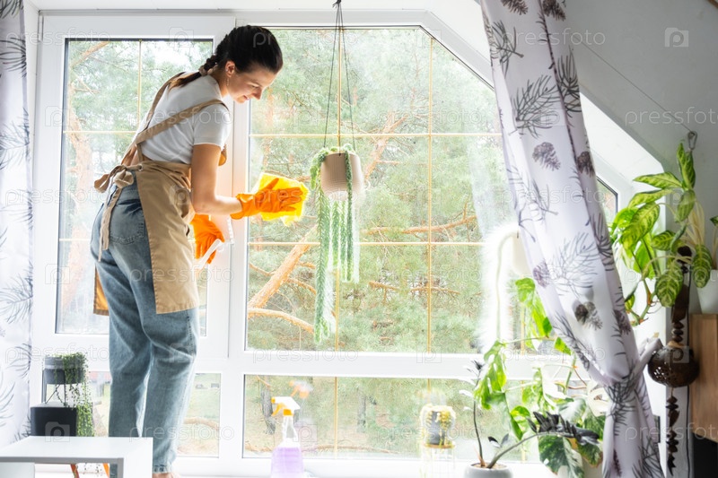 Женщина в резиновых перчатках и фартуке вручную моет мансардное окно дома тряпкой и шваброй внутри интерьера с домашними растениями. Восстановление порядка и чистоты весной, уборка сервиза