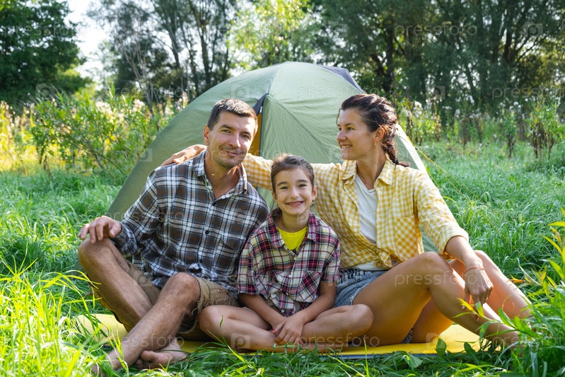 Портрет счастливой семьи, сидящей утром возле палатки для кемпинга на открытом воздухе, кемпинг, семейная походная поездка
