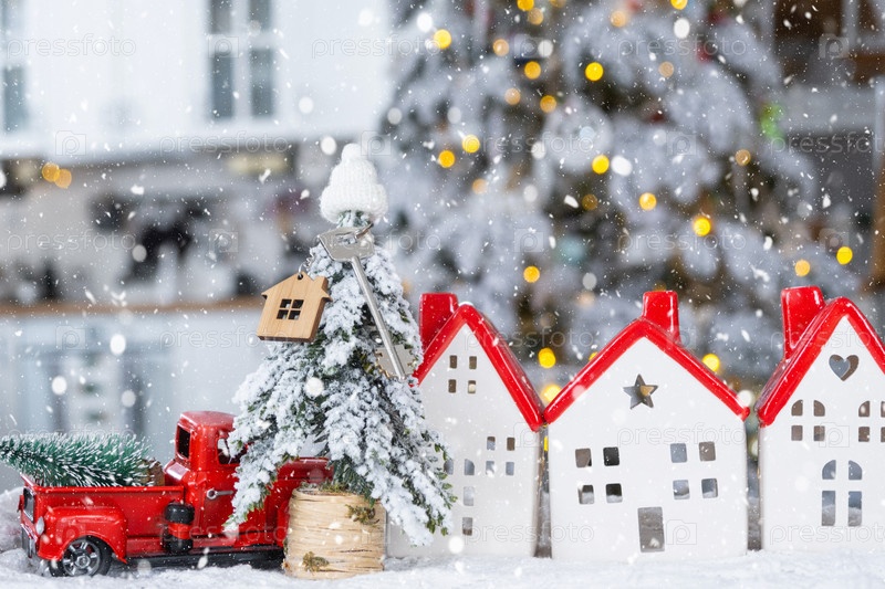 Ключ на елке и крошечный домик с красной крышей с рождественским декором в красном ретро-автомобиле на столе. Подарок на Новый год. Страхование, переезд в новый дом, ипотека, аренда и недвижимость