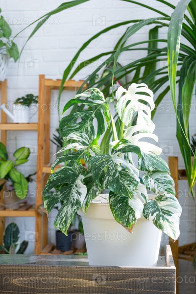 Монстрия Альба является редким разноцветным крупным планом в интерьере на стенде. Выращивание комнатных растений и уход за комнатным растением, зеленый дом