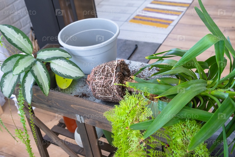 Юкка, аглаонема, папоротник на столе для пересадки и ухода за домашними растениями в интерьере зеленого дома с горшечными растениями