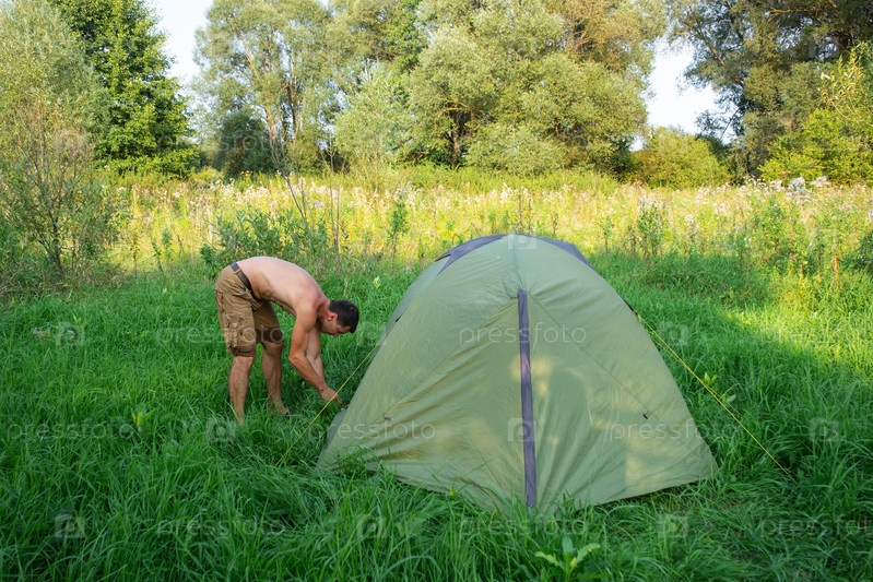 Мужчина устанавливает и собирает туристическую палатку в кемпинге на природе в лесу. Внутренний туризм, активные летние каникулы, семейные приключения. Экотуризм, спорт, поход