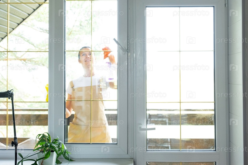 Женщина в резиновых перчатках и фартуке вручную моет оконный балкон дома тряпкой и шваброй снаружи за стеклом. Восстановление порядка и чистоты весной, уборка сервиза