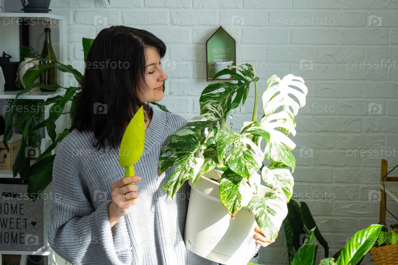 Женщина держит дома растение редкого варегатного монстра Альба в горшке в домашнем интерьере