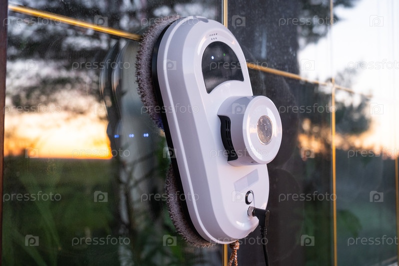 Робот-очиститель окон очищает окна в доме снаружи. Помощник по уборке, безопасная уборка окон, пульт дистанционного управления