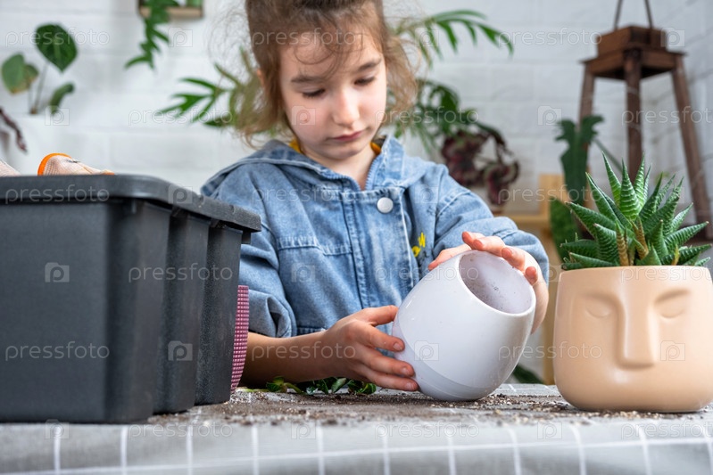 Хобби девушки - пересадка домашних горшечных растений, девушка держит в руках цветочный горшок