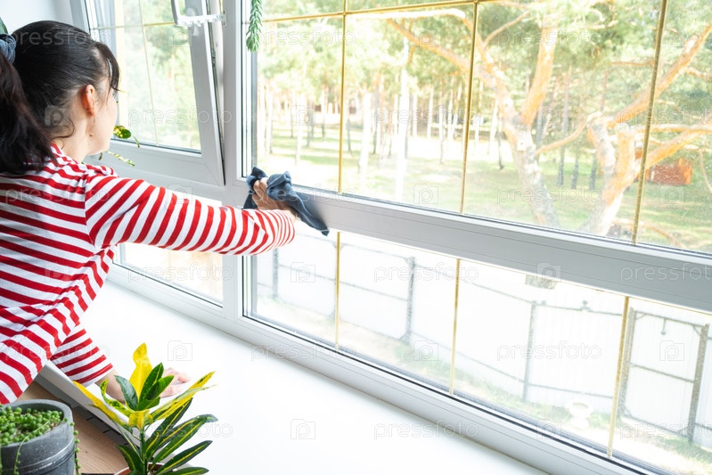 Женщина вручную моет окно дома тряпкой и шваброй внутри интерьера с домашними растениями на подоконнике с чердаком. Восстановление порядка и чистоты весной, уборка сервиза