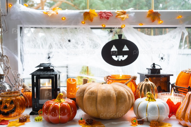 Праздничный декор дома на подоконнике к Хэллоуину - тыква, Джек о фонари, черепа, паутина, пауки, скелеты, свечи и гирлянда - уютное и страшное настроение