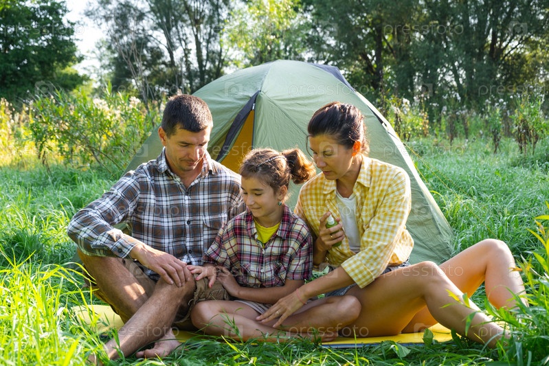 Семья использует отталкивающий открытый кемпинг и пикник возле палатки