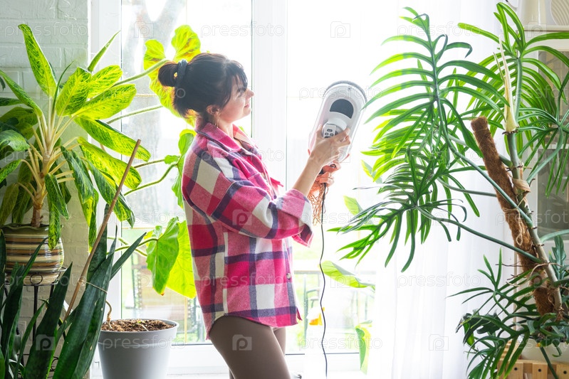 Женщина запускает робота-уборщика окон дома внутри интерьера с домашними растениями. Домашняя робототехника, домашний помощник, уборка сервиза