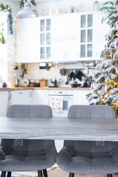 Серый деревянный пустой стол, чтобы продемонстрировать продукт с пространством для текста с обитыми стульями на белой кухне, современным интерьером с рождественской елкой и сказочными огнями. Новый год, рождественское настроение, уютный дом