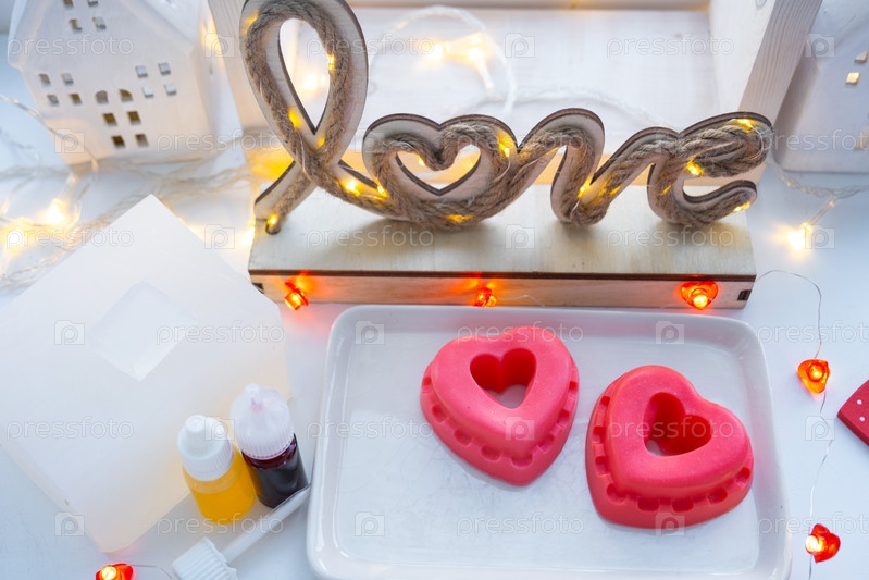 Домашнее мыло ручной работы в форме сердца для подарка на День святого Валентина любимой. Парфюмерия и красители, мыльная основа на столе