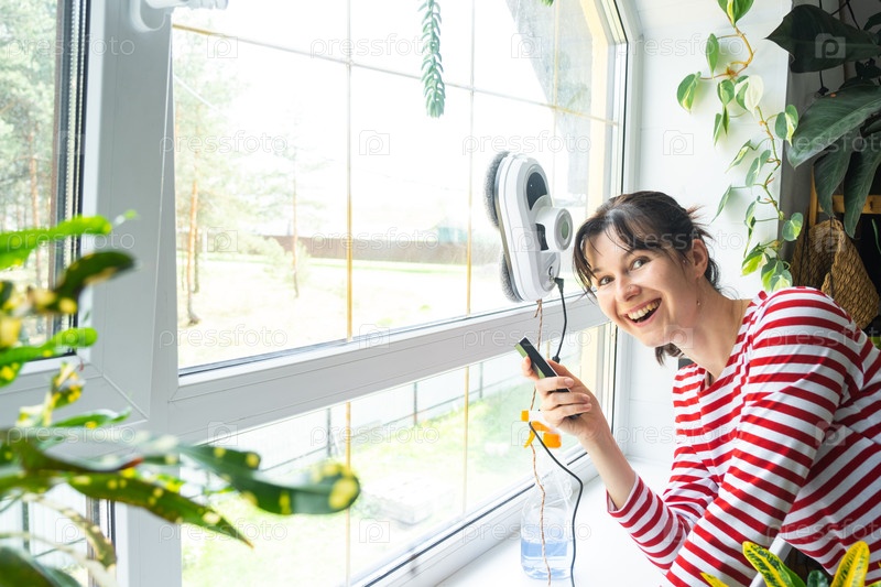 Женщина запускает робота-уборщика окон дома внутри интерьера с домашними растениями. Домашняя робототехника, домашний помощник, уборка сервиза