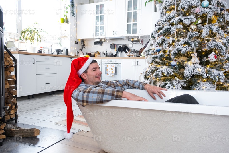 Человек в шляпе Санта лежит отдыхающим в Новой ванне под елкой в качестве новогоднего подарка в интерьере белой декорированной кухни. Реконструкция и дизайн интерьера, строительство и улучшение дома