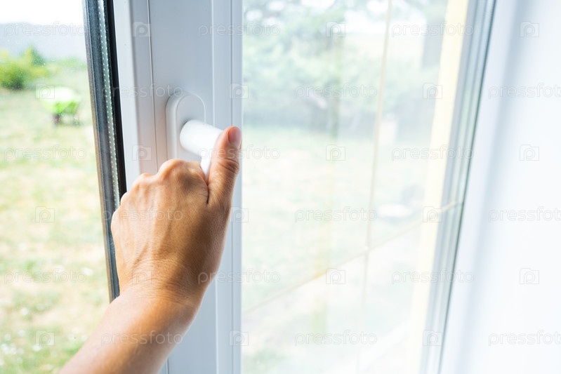 Рука держит рукоятку пластикового стеклопакета, закрывая и открывая окно поворотным механизмом, положение рукоятки для вентиляции, микровентиляции