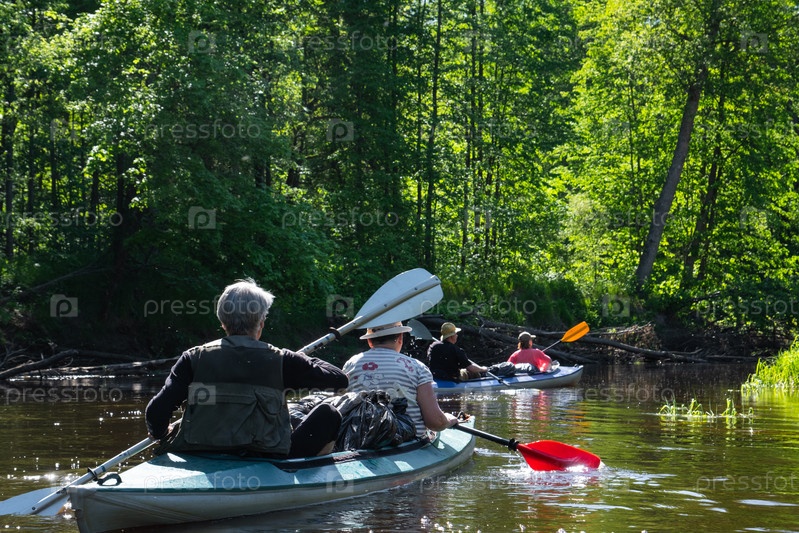 Групповая поездка на байдарках для сеньора и сеньоры. Пожилая пара и взрослая гребная лодка на реке, поход по воде, летнее приключение. Возрастные виды спорта, умственная молодость и здоровье, туризм, активная старость