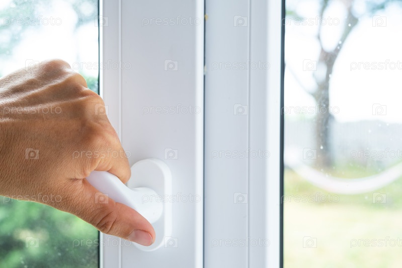 Рука держит рукоятку пластикового стеклопакета, закрывая и открывая окно поворотным механизмом, положение рукоятки для вентиляции, микровентиляции