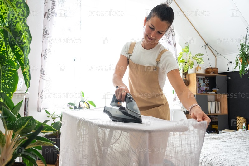 Домохозяйка женщины в фартуке утюги льняные шторы в комнате на гладильной доске