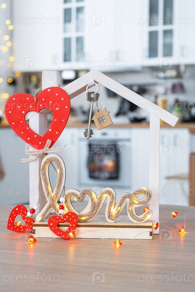 Ключ к крошечному дому уютного дома с декором Валентина на столе кухни. Подарок на день валентинок, семейное гнездо любви. дизайн, проект, переезд в новый дом, ипотека, аренда и покупка недвижимости