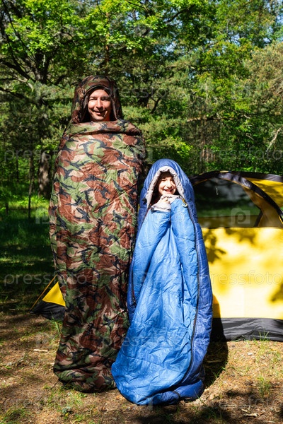 Семья туристов от отца и дочери позирует и весело танцует в спальных мешках возле палатки. Семейный отдых на открытом воздухе, кемпинг, походное снаряжение